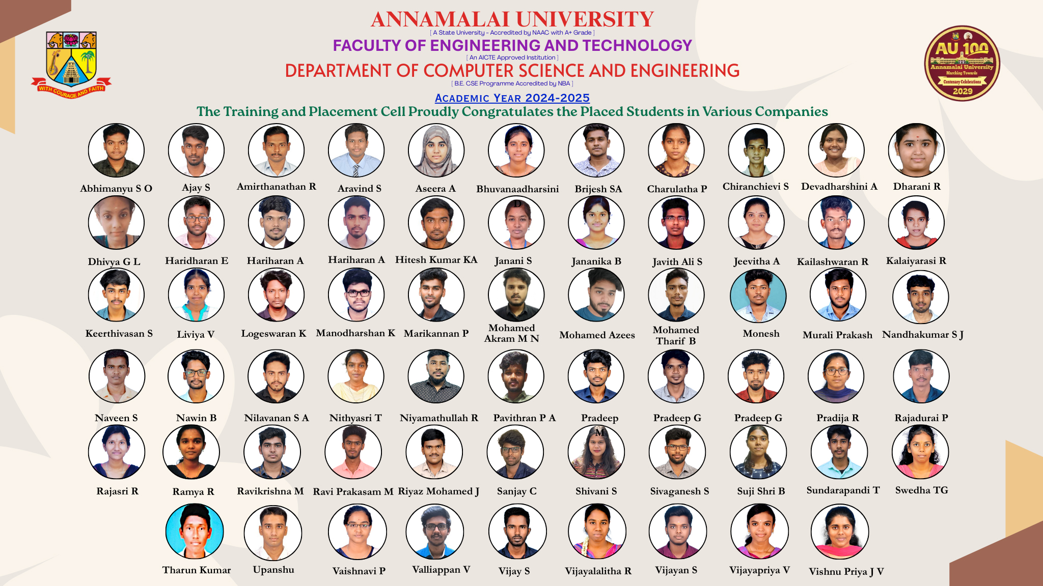 The department plays a vital role in locating job opportunities for the students who are all passing out of the department by keeping in touch with top-notch companies. The department operates throughout the year to facilitate interactions between companies and budding graduates.The illustrious alumni of the institution have extended their fullest support in the placement-related activities and roped in many companies for the campus drive, besides conducting pre-placement training programmes at frequent intervals to improve the students’ skill set.